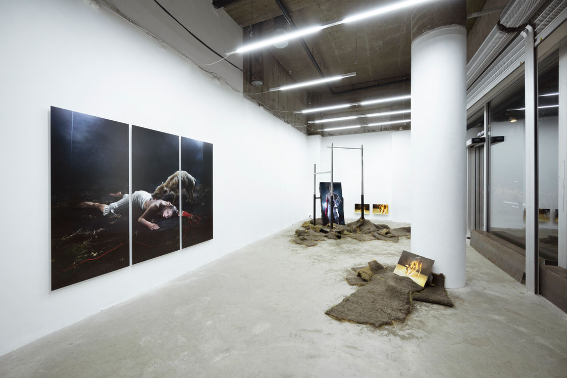 on the field of playing: ACT 1 operates within the terrain of domestication, specifically the practice of training and taming of our canine companions. In Ville Vidø’s theatrical universe, we witness the convoluted play between trainer and animal, a reflection of the systems of power, as well as (for some) the debilitating codes of behaviour in our efficiency-centric world. Navigating this societal framework with bipolar disorder has forced Vidø to use survival tactics of role-playing as a masquerade of power, consistently battling the expectations of obedience and mental agility. Submission and dominance: Depression and mania, become dichotomous forces and a metaphor for alienating and dividing hierarchies. The fictional characters of The Field insist we co-speculate, to dream forward more caring structures - allowing alternative narratives, individuality, and unique experiences.